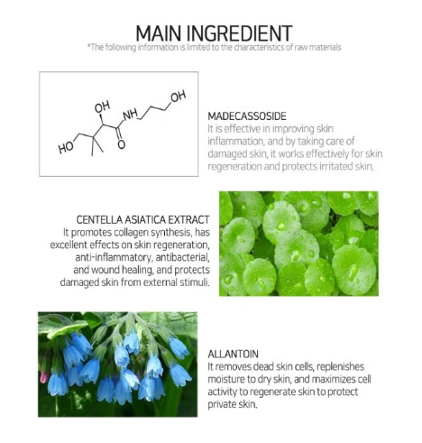 Madecassoside, which helps to soothe skin damaged by external environment, improves skin condition and keeps skin moist and smooth.