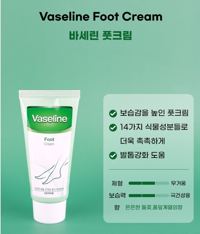 • USE AS A FOOT MASK – Wash and dry feet and apply a generous layer of Vaseline Deep Moisture Foot Cream. Wear a pair of socks over your feet all night to lock in moisture.