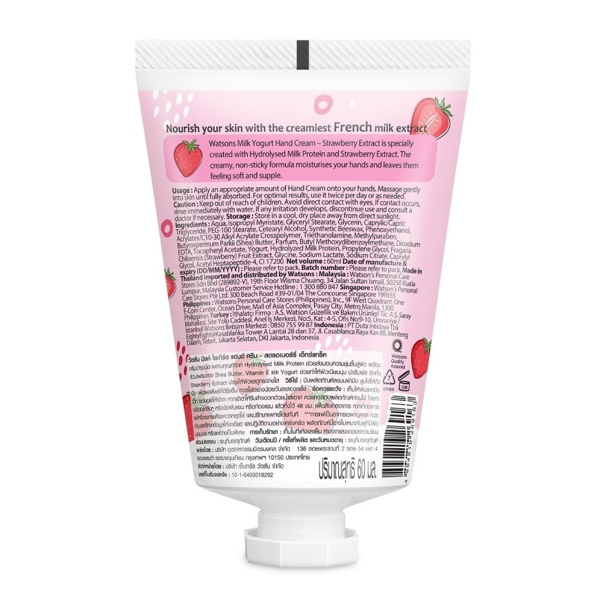 Watsons Milk Yogurt Hand Cream Hydrolysed Milk Protein Amino Acid Vitamin E -Strawberry Extract is specially created with Hydrolysed Milk Protein and Strawberry Extract. The creamy, non-sticky formula moisturises your hands and leaves them feeling soft and supple.Nourish your skin with the creamiest French mik extrack. Keep out of reach of children. Avoid direct contact with eyes. If contact occurs,rinse immediately with water. If any irritation develops, discontinue use and consult a doctor if necessary.Storang : Store in a cool,day place away from direct sunlight.